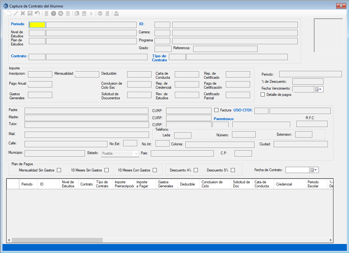 Lleva el registro de tipo de pago(efectivo, tarjeta, transferencia), generando el adeudo por concepto.